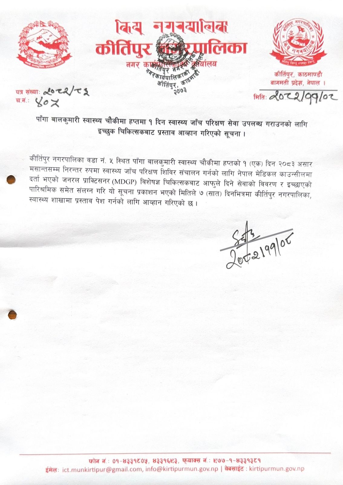 पाँगा बालकुमारी स्वास्थ्य चौकीमा हप्तामा १ दिन स्वास्थ्य जाँच परिक्षण सेवा उपलब्ध गराउनको लागि इच्छुक चिकित्सकबाट प्रस्ताव आव्हान गरिएको सूचना। Last Updated. : भदौ १७ गते, २०८१