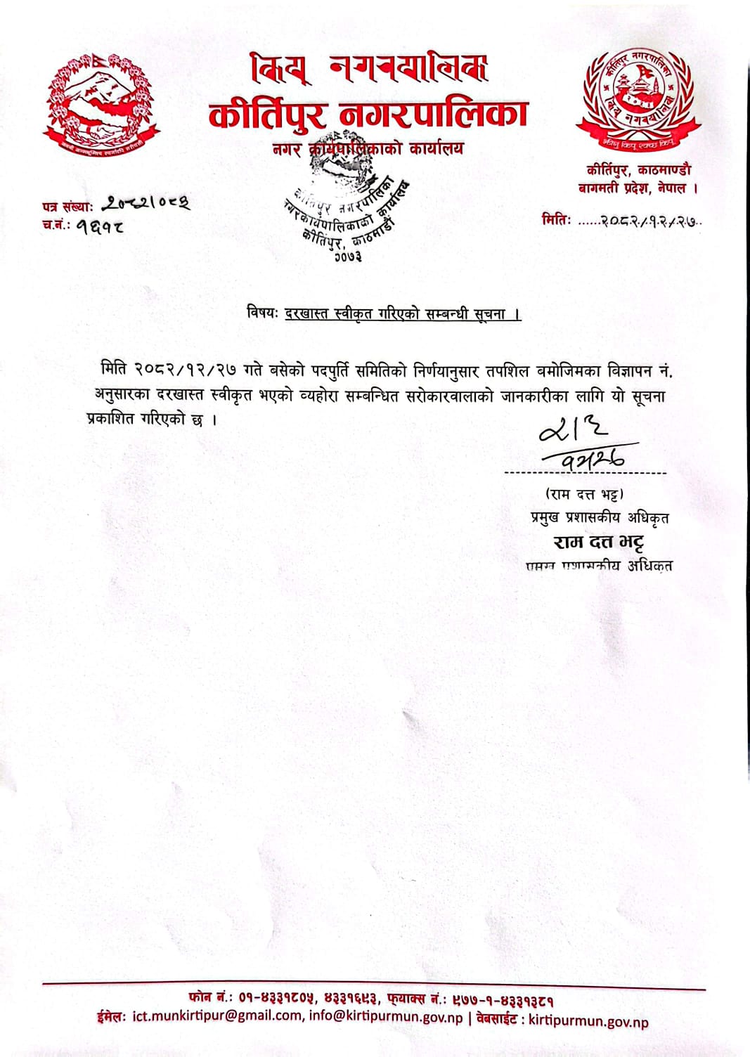 साँस्कृतिक र प्राकृतिक सम्पदायुक्त, शैक्षिक एवं पर्यटकीय शहर स्वच्छ हराभरा, समाबेशी तथा समुन्नत हाम्रो कीर्तिपुर नगर !